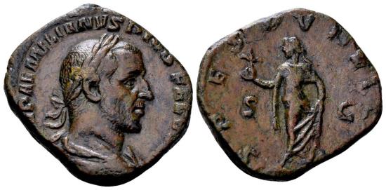 Rome, 253 AD. Æ sestertius, 18.94 gr., 28 mm. Obv: [IM]P AEMILIANUS PIUS FEL [AUG]; laureate, draped, cuirassed bust of Aemilian to the right. Rev: SPES PUBLICA; Spes advancing to the left, holding flower and raising skirt; across fields: S C. Ref: RIC 39; Banti 13. Very rare. Brown tone. Good Very Fine. An expressive face of this short-lived emperor and a gem of mid 3rd century die-cutting. |