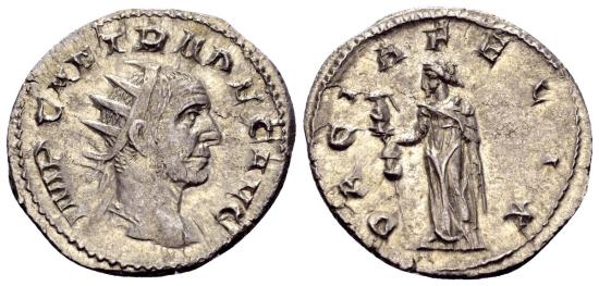 Uncertain mint, 251 AD. AR antoninianus, 3.37 gr., 21.6 mm. Obv: IMP CAE TRA DEC AUG; radiate and cuirassed bust of Trajan Decius to the right, Rev: DACIA FELIX; Dacia standing facing, head to the left, holding standard in her right hand. Ref: RIC 37b. Extremely fine. |