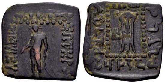 Obv: BAΣΙΛΕΩΣ AΠOΛΛOΔOTOY ΣΩTHPOΣ; Apollo standing facing, holding arrow and leaning on bow; around on three sides.