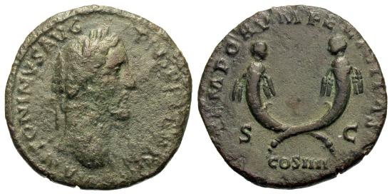 Reign: Emperor, A.D. 138-161 Denomination: Æ Sestertius. Diameter: 33 mm. Weight: 26.19 grams. Mint: Rome, A.D. 148-149. Obverse: Laureate head right. Reverse: Crossed cornucopiae containing grape bunches flanked by two grain ears, surmounted by the busts of two boys, vis-à-vis