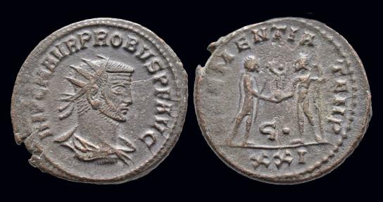 Probus (276-282AD) Billon antoninianus- 4,42 gram- 22 mm, Antioch mint, struck 280AD obv: IMP C M AVR PROBVS P F AVG, radiate, draped and cuirassed bust right rev: CLEMENTIA TEMP, emperor standing right, holding sceptre, receiving Victory from Jupiter, standing left, holding scepter; S• between, XXI in exergue RIC 922 |
