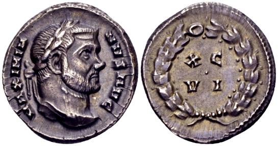 Carthage, 300 AD. AR argenteus, 3.45 gr., 18 mm. Obv: MAXIMIANUS AUG, laureate bust of Maximian to the right. Rev: XC VI in two lines surrounded by laurel wreath, in centre: pellet. Ref: RIC 15b. From the David Miller collection, collector's ticket included. Very rare. Beautiful old cabinet tone. Extremely fine. Assigned to Carthage in RIC, though having no mint mark to prove this, it has since been postulated that this type might better be attributed to the mint at Rome due to stylistic parallels and the chance find in an English hoard of a piece with PR in the reverse exergue. |