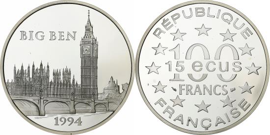 | | France, 100 Francs-15 Ecus, Monnaie de Paris, Big Ben, 1994, Paris, Silver | | | Stars surround denominations, (francs/euros), Big Ben, London, date below | | FEATURES |