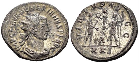 Numerian. 283-284 AD. AE Silvered Antoninianus (3.85g, 21.5mm). Cyzicus mint. Obv.: IMP C M AVR NVMERIANVS P F AVG, radiate, draped and cuirassed bust right. Rev.: Rev.: VIRTVS AVGG, emperor standing right, holding scepter, receiving Victory on globe from Jupiter standing left, holding scepter; A in lower field; XXI in exergue. RIC 466. gVF. |