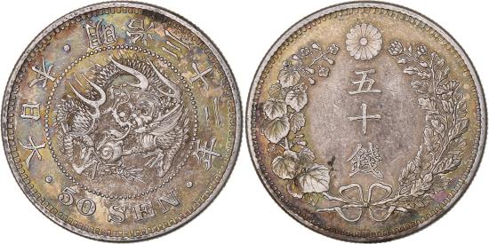| | Japan, Meiji, 50 Sen, 1899, Silver, | | | Year 32 (1899). Cleaned. Y#25 ; JNDA 01-14. | | FEATURES |