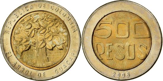 | | Colombia, 500 Pesos, 2006, Bi-Metallic, , KM:286 | | | Guacari tree within circle, Denomination within circle, date below | | FEATURES |