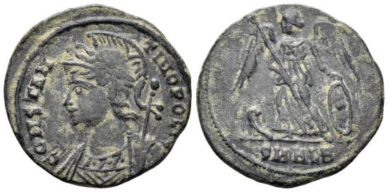 City Commemorative. 330-354 AD. AE Follis (2.36g, 18mm). Alexandria mint. Struck 335-7 AD. Obv.: CONSTANTINOPOLIS, mantled bust of Constantinopolis left wearing laureate crested helmet and holding reversed spear over shoulder. Rev.: Victory standing facing, head left, in prow of galley holding spear and resting on shield; SMALB in exergue. RIC 64. VF.