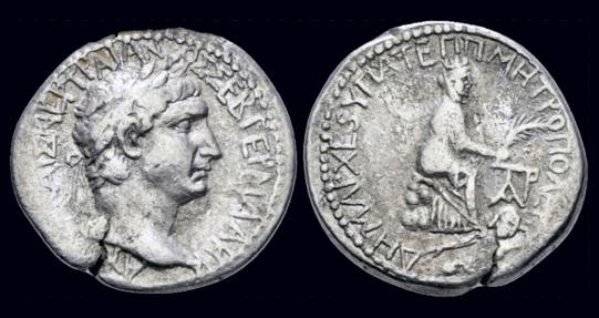 Kilikia Tarsos Trajan (98-117AD) AR tetradrachm- 12,65 gram- 27 mm, struck 103-111AD obv: laureate haed right rev: city-goddess, turreted and veiled, seated right, holding palm in her right hand; to right at her feet, river-god Kydnos, crowned with wreath of sedge, swimming right, ; in field to right, , monogram of Tarsos Prieur 754-756 RPC III 3257 |