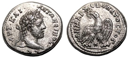 Obverse: AVT KAI ANTΩNEINOC CE. Laureate head to right. Reverse: ΔHMAPX EΞ VPATOC TO Γ. Eagle standing facing, head left, wreath in its beak. Star below.