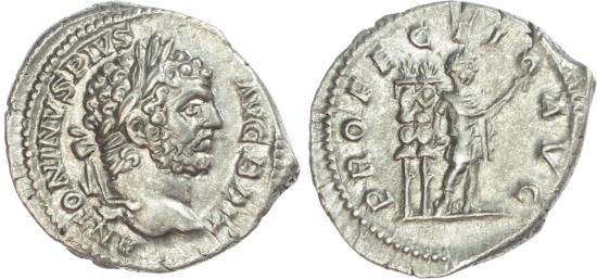 Caracalla (AD 198-217), Silver Denarius, Rome, AD 210-213, 2.93g. Obverse: Laureate head of Caracalla right. Reverse: Emperor standing right, holding spear, two standards behind. (RIC 225; RSC 509). Extremely Fine.