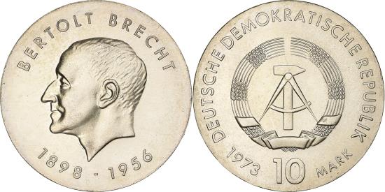 | | Democratic Republic of Germany, 10 Mark, 1973, Silver, , KM:45 | | | State emblem, denomination, Head left, dates below | | FEATURES |