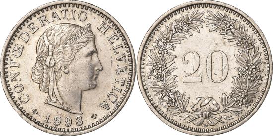 | | Switzerland, 20 Rappen, 1993, Bern, Copper-nickel, , KM:29a | | | Crowned head right, Value within wreath, Karl Schwenzer | | FEATURES |