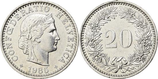| | Switzerland, 20 Rappen, 1985, Bern, Copper-nickel, , KM:29a | | | Crowned head right, Value within wreath, Karl Schwenzer | | FEATURES |