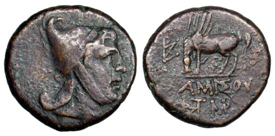Pontos. Amisos. Time of Mithradates VI Eupator 120-63 BC Æ 24mm 10.4g Head of Mithradates VI as Perseus right, wearing Phrygian cap / AMIΣOY, Pegasos grazing left; monogram to left, two monograms below. SNG BM Black Sea 1213-1215; HGC 7, 239. From the 1930’s Collection of Robert W. Hubel of Michigan. CNG E-auction 588 lot 1147 |