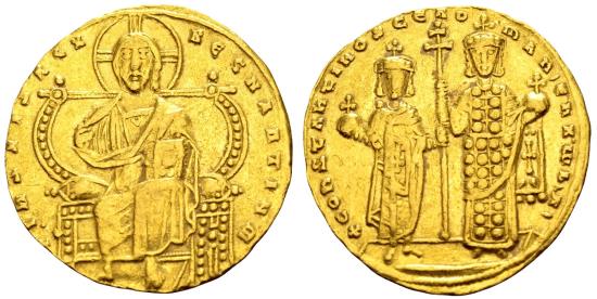 Constantinople, 945-946 AD. AU solidus, 4.41 gr., 21 mm. Obv.: + IhS XPS RЄX-RЄϚNANTIЧm; Christ facing seated on throne with curved back, wearing nimbus cruciger, pallium and colobium, right hand raised in benediction and holding book of Gospels in left. Rev.: + COhStAhtIhOS CЄ RO-MAh' Єh' Xw b' R'; Constantine VII on the right, bearded, wearing loros with cross on sleeve, and Romanus II, on the left, crowned, standing facing figures of wearing chlamys with cross on front, both on rectangular dais, globus cruciger in outer hand, jointly holding long patriarchal cross with globular terminus between them. Ref.: DOC 10.3. Sear 1749. Rare. Nearly Extremely Fine. |