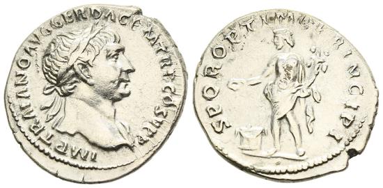 Trajan, 25 January 98 - 8 or 9 August 117 A.D. RS116351. Silver denarius, Woytek 217b, BMCRE III 206, BnF IV 392, RSC II 394, RIC II 184, SRCV II 3160, Strack I 109, Hunter II 58 var. (aegis), Choice gVF, full legends, flow lines, small edge cracks/splits, 3.063g, 19.6mm, 180o, Rome mint, IMP TRAIANO AVG GER DAC P M TR P COS V P P (Latin: Supreme commander, Trajan, emperor, victor over the Germans, victor over the Dacians, high priest, holder of tribunitian power, consul 5 times, father of the nation), laureate bust right, slight drapery on left shoulder; reverse S P Q R OPTIMO PRINCIPI (Latin: Senatus Populusque Romanus Optimo Principi - [From] the Senate and People of Rome, [dedicated to] the best of Princes), Genius standing slightly left, head left, nude but for chlamys around waist and over left arm, pouring libations from patera in right hand, cornucopia in left hand, altar at feet on left In Roman religion, every man has a genius, a presiding spirit. In De Die Natali, Censorinus says, from the moment we are born, we live under the guard and tutelage of Genius. Cities, organizations, and peoples also had a genius. On coins, we find inscriptions to the Genius of the Army, of the Senate, of the People, of the Emperor, etc. |
