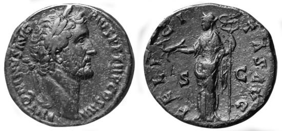 ANTONINVS AVG PIVS P P TR P COS IIII Laureate head of Antoninus Pius to right. Rev. FELICITAS AVG / S - C Felicitas standing front, head to left, holding capricorn in her right hand and long caduceus in her left.