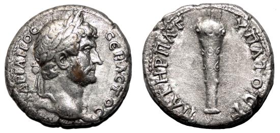 Obverse: ΑΔΡΙΑΝΟϹ ϹΕΒΑϹΤΟϹ. Laureate head of Hadrian, right. Reverse: ΥΠΑΤΟϹ Γ ΠΑΤΗΡ ΠΑΤ. Club, handle at top. Nice specimen of this uncommon and interesting issue, in VF+ condition, conserving complete details on both sides and bold reliefs checkable at photo. Besides the coin looks quite better in the hand than in the photo. RPC III 3015. Caesarea (Cappadocia) mint, AD 128-138. 6,5 g - 20 mm -------------------------------------------------------------------------------------------------- Visit our site about Numismatics and Archaeology: aeternitas-numismatics.com |