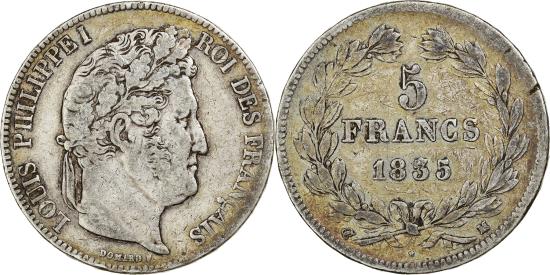 | | France, 5 Francs, Louis-Philippe, 1835, Toulouse, Silver, | | | Louis-Philippe, Laureate head right, Mint marks at edge outside wreath | | FEATURES |