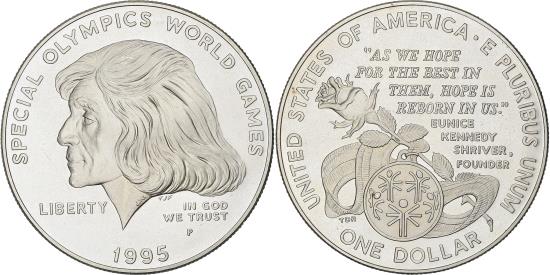 | | United States, Dollar, 1995, Philadelphia, Silver, , KM:266 | | | Eunice Schriver head left; founder of the Special Olympics, Special Olympics Logo on an award medal, rose, quote from Schriver, SPECIAL OLYMPIC WORLD GAMES // LIBERTY - IN GOD / WE TRUST / P // 1995, UNITED STATES OF AMERICA . E PLURIBUS UNUL // " AS WE HOPE / FOR THE BEST IN / THEM, HOPE IS / REBORN IN US. " / EUNICE / KENNEDY / SHRIVER, FOUNDER // ONE DOLLAR | | FEATURES |