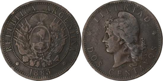 | | Argentina, 2 Centavos, 1883, Bronze, , KM:33 | | | Flagged arms within wreath, 1/2 radiant sun above, Capped liberty head left, Prev. KM#8. | | FEATURES |