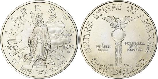 | | United States, Dollar, 1989, Denver, Silver, , KM:225 | | | Statue of Freedom in clouds and sunburst, Mace from the House of Represenatives, LIBERTY // 1789 - 1989 / D // IN GOD WE TRUST, UNITED STATES OF AMERICA // E / PLURIBUS / UNUM - BICENTENIAL / OF THE / CONGRESS // WW - CYM // ONE DOLLAR | | FEATURES |