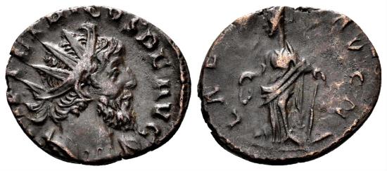Tetricus I. 271-274 AD. AE Antoninianus (2.34g, 18mm). Treveri mint. Struck 272 AD. Obv.: [IMP] TETRICVS P F AVG, radiate and cuirassed bust right. Rev.: LAE[TITIA] AVG N, Laetitia standing left with anchor and wreath. RIC 90. VF.