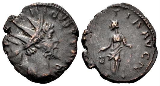 Tetricus I. 271-274 AD. AE Antoninianus (2.53g, 19mm). Treveri mint. Struck 272 AD. Obv.: [IMP TET]RICVS P F AVG, radiate and cuirassed bust right. Rev.: [LAETI]TIA AVG N, Laetitia standing left with anchor and wreath. RIC 90. VF.