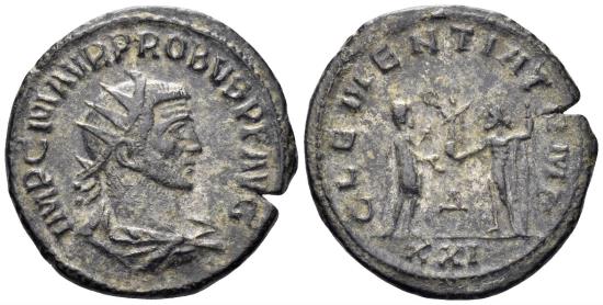 Probus. 276-282 AD. AE Antoninianus (3.71g, 21mm). Antioch mint. Struck 280 AD. Obv.: IMP C M AVR PROBVS P F AVG, radiate, draped and cuirassed bust right. Rev.: CLEMENTIA TEMP, emperor standing right, holding sceptre, receiving Victory from Jupiter, standing left, holding scepter; Δ between; XXI in exergue. RIC 922. VF. |