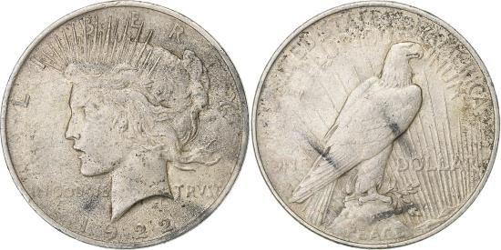 | | United States, Dollar, Peace, 1922, Philadelphia, Silver, , KM:150 | | | Peace Dollar, Liberty Head left, Eagle facing right perched on rock, LIBERTY IN GOD WE TRVST, UNITED STATES OF AMERICA E PLURIBUS UNUM | | FEATURES |