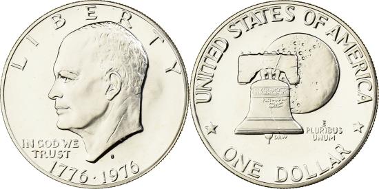 | | United States, Dollar, Eisenhower, 1976, U.S. Mint, Proof, Copper-Nickel Clad | | | Eisenhower Dollar, Bicentennial design, moon behind Liberty Bell, In 1976 the lettering on the reverse was changed to thinner letters, resulting in the Type II variety for that year. The Type I variety was minted 1975 and dated 1976. | | FEATURES |