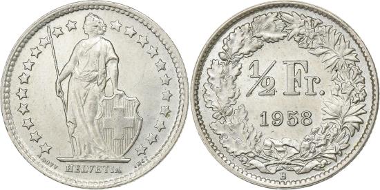 | | Switzerland, 1/2 Franc, 1958, Bern, Silver, , KM:23 | | | HELVETIA | | FEATURES |