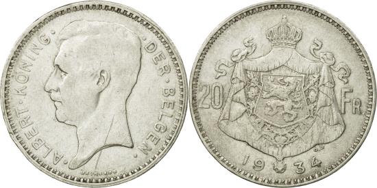 | | Coin, Belgium, 20 Francs, 20 Frank, 1934, , Silver, KM:104.1 | | | Head of Albert, left, legend in Dutch, Crowned arms divide denomination and date, DER BELGEN | | FEATURES |