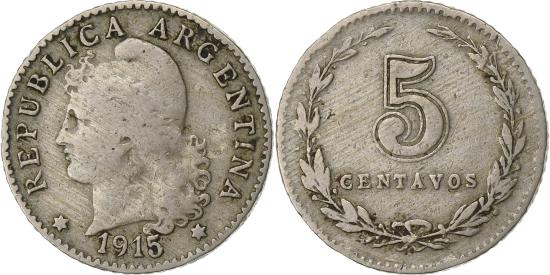 | Argentina, 5 Centavos, 1915, Copper-nickel, |