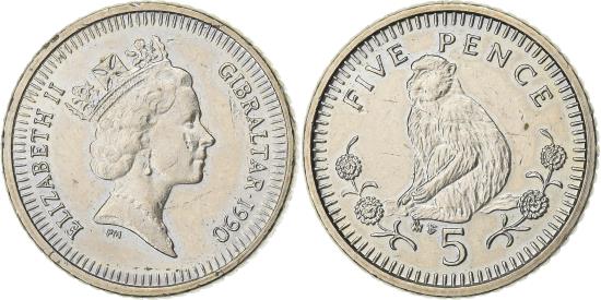 | | Gibraltar, Elizabeth II, 5 Pence, 1990, Copper-nickel, , KM:22.2 | | | Crowned head right, Barbary ape divides denomination, Reduced size. | | FEATURES |