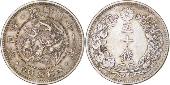 | | Japan, Meiji, 50 Sen, 1898, Silver, | | | Year 31 (1898). Cleaned. Y#25 ; JNDA 01-14. | | FEATURES |