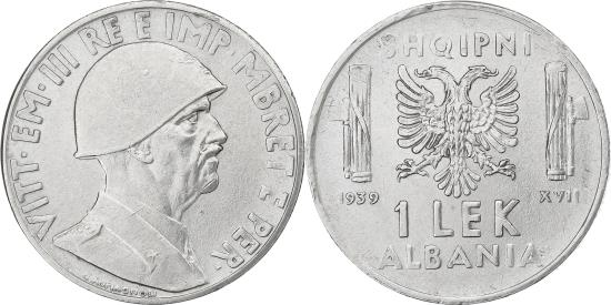 | | Albania, Vittorio Emanuele III, Lek, 1939, Rome, Stainless Steel, | | | Helmeted head right, Double eagle between columns, value below, Coins dated after 1939 were not struck for circulation. | | FEATURES |