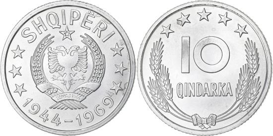 | | Albania, 10 Qindarka, 1969, Aluminum, , KM:45 | | | National Arms, two dates, Five stars across top, value at center between wheat | | FEATURES |