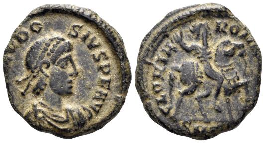 Theodosius I the Great. 379-395 AD. AE3 (2.13g, 15mm). Cyzicus mint. Struck 392-5 AD. Obv.: [D N THE]ODOSIVS P F AVG, pearl-diademed, draped and cuirassed bust right.. Rev: GLORIA ROMA[NORVM], emperor on horseback right, raising right hand; SM[KΓ] in exergue. RIC 29a; LRBC 2574. VF.