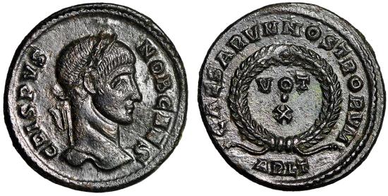 Crispus, Eldest son of Constantine I The Great AE Nummus Arles (Arelate) Mint as Caesar 322 AD Obverse: CRISPVS - NOB CAES Head of Crispus, laureate, right Reverse: CAESARVM NOSTRORVM VOT/X within a laurel wreath; ARLT in exergue References: RIC 247 Size: 18mm, 2.89g Professional Numismatic Notes: Extremely-fine; a scare type! More attractive in hand!