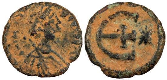 AE Pentanummium 2.18g. 15mm. Antioch Mint Diademed, draped and cuirassed bust, r. D N IVSTINIANVS PP AVG Large E with cross at center, star to r. SB 244 Dark patina with much orange desert fill. Some mild roughness, as typical.
