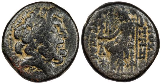AE Large Denomination 8.90g. 20mm. Pompeian Era year 3-17 (64-49 B.C) Antioch Mint Laureate head of Zeus, r. Zeus seated l., holding Victory with wreath and sceptre; AO or (delta)O (or similar) monogram above star in inner l. field; In ex.: [date] [AN]TIOXE[WN] THS [MH]TROPOLE[WS] cf. RPC I 4201-4215 Dark black-brown patina with glossy surfaces and some earthen contrast. Trace porosity.