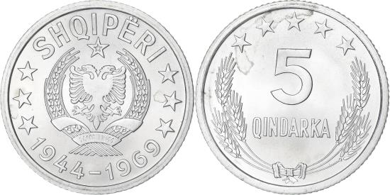 | | Albania, 5 Qindarka, 1969, Aluminum, , KM:44 | | | National Arms, two dates below, Five stars across top, value in center of wheat | | FEATURES |
