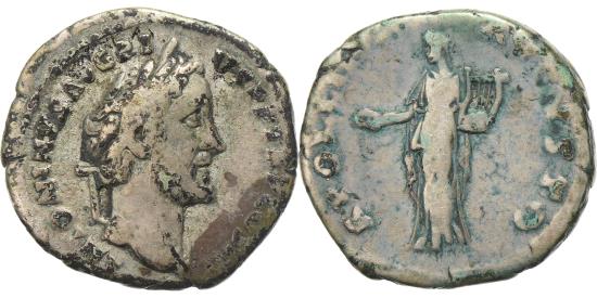 | | Antoninus Pius, Denarius, 140-143, Rome, Silver, , RIC:63Bc | | | Head of Antoninus Pius, laureate, right., Apollo, in long robe reaching feet, standing left, holding patera in extended right hand and lyre in left., ANTONINVS AVG PIVS P P TR P COS III, APOLLINI AVGVSTO | | FEATURES |