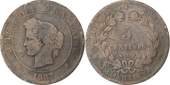 | | France, 5 Centimes, Cérès, 1887, Paris, Bronze, , Gadoury:157a | | | Cérès, Laureate head left, Denomination within wreath | | FEATURES |