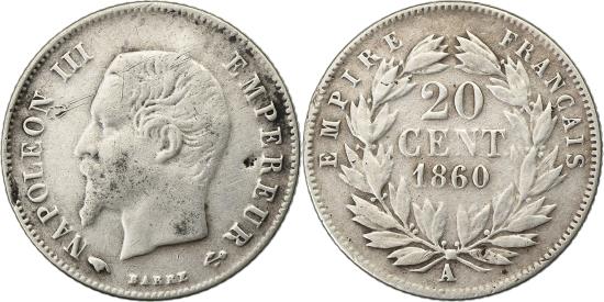 | | France, Napoleon III, 20 Centimes, 1860, Paris, Silver, , Gadoury:305 | | | Napoléon III, Head left, Denomination within wreath | | FEATURES |