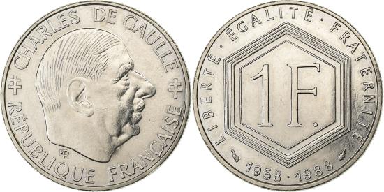 | | France, Franc, Charles de Gaulle, 1988, Paris, Nickel, , Gadoury:475 | | | Charles de Gaulle, Head right, Denomination within six sided wreath, dates below | | FEATURES |