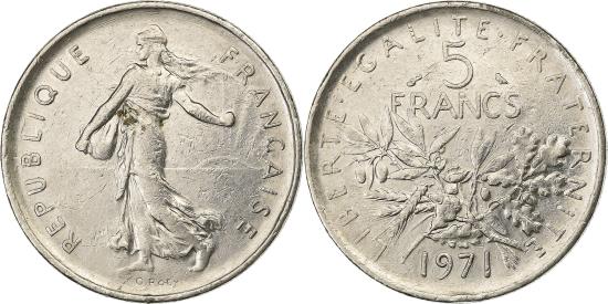 | | France, 5 Francs, Semeuse, 1971, Paris, Nickel Clad Copper-Nickel, | | | Semeuse, The Seed Sower, Branches divide denomination and date | | FEATURES |