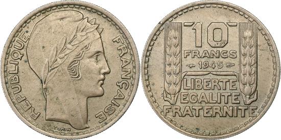 | | France, 10 Francs, Turin, 1945, Paris, Copper-nickel, , Gadoury:810 | | | Turin, Laureate head right, long leaves and short leaves, Denomination above date, inscription below, grain columns flank, Large head. | | FEATURES |
