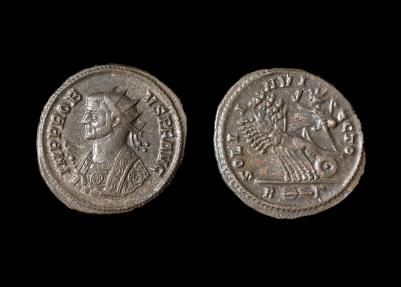 Probus Ae Antoninianus. Rome mint. IMP PROBVS PF AVG, radiate, mantled bust l., holding eagle-tipped sceptre. Rev., SOLI INVICTO, Sol in quadriga leaping l., mintmark R thunderbolt Γ in ex. RIC 200; Cohen 648. 3.82g, 22mm. |